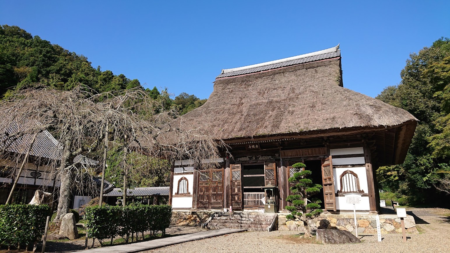 自分の自転車であれば丘陵を越えて行ける。さわやかな農場と整然とした工業団地を越えて、2020年とは違う道を通りつつ安国寺に辿り着いた。その頃には周囲の山々も完全に晴れ上がった。山門を囲む木々はまだ紅葉に達していないが、それでも秋らしい黄褐色を差している。足利尊氏の産湯と伝わる井戸や、尊氏およびその母・妻を供養する宝篋印塔などがある。しかし最も印象に残ったのは非常に大きな茅葺屋根の仏堂であった。丹波の農村を歩いていれば、ときおり屋根に急な角度を付けた入母屋造の古民家を見かける。現在は板葺や瓦葺に改造しているものが多いが、それはもともと茅葺であった。安国寺は上杉家や足利家の庇護を受けた強力な寺院であったが、その仏堂の形は民俗との連続性も感じさせる。