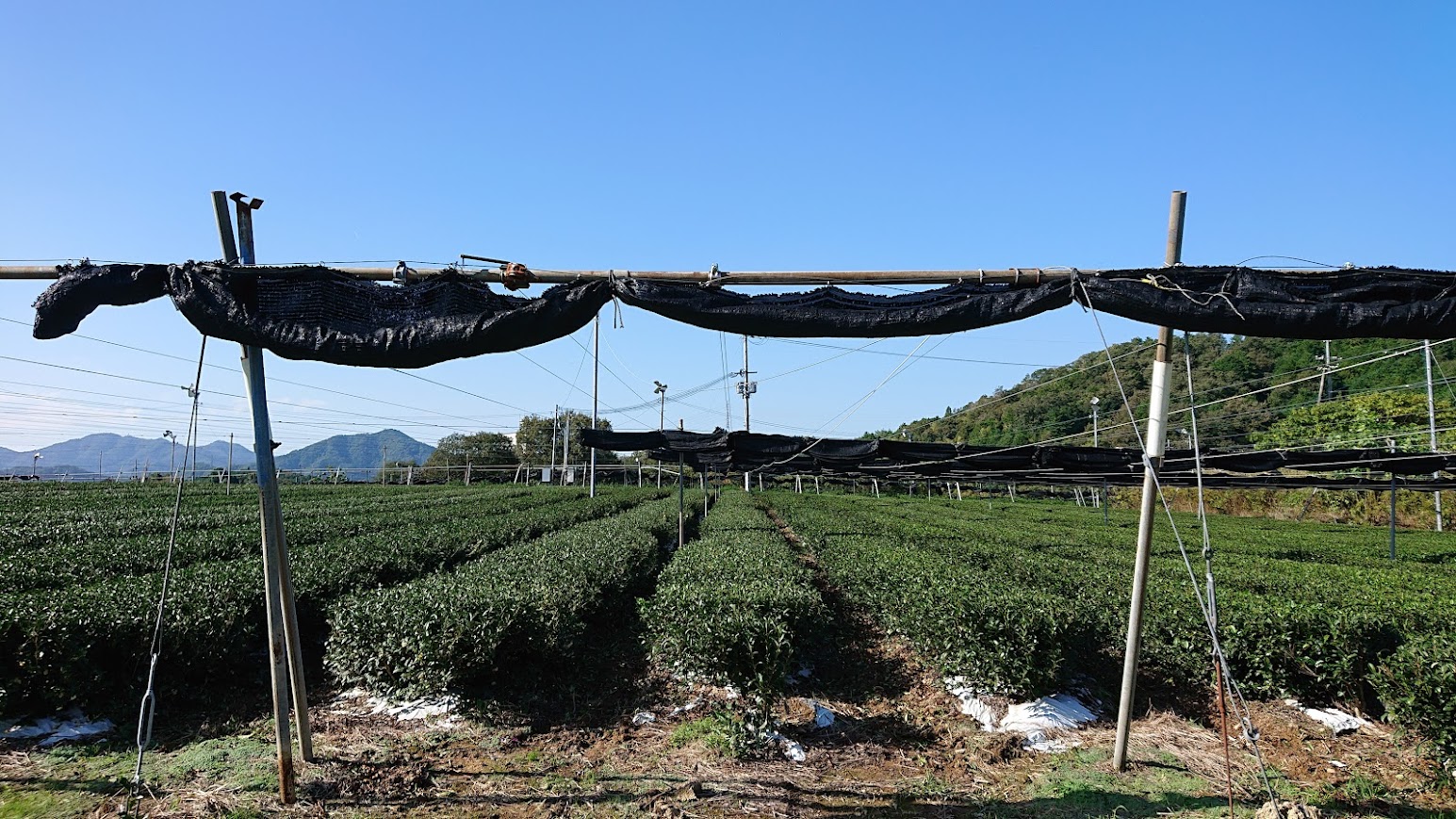 由良川南岸の堤を走りつつ、途中で府道9号線の橋を渡り、また丘陵地へと自転車を進めた。府の農業大学校へと続く坂道を上り切れば、台地の上に平坦な圃場が開けて、その一角を茶畑が占めている。空が広く、遠くの山並みも見渡せる茶畑だ。すぐ下の高速道路はひっきりなしに車が通り過ぎるが、日曜日の畑を割る道には人も車もほとんど通らない。グンゼスクエアで味わった抹茶のふるさとは、防霜ファンの遅い回転と同じような緩やかな時間に抱かれていた。