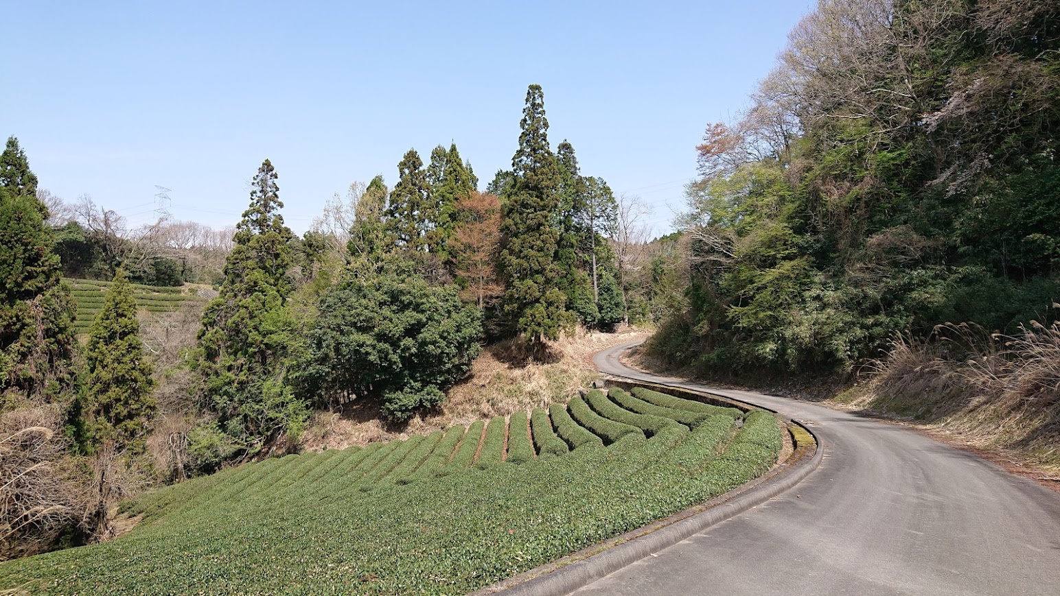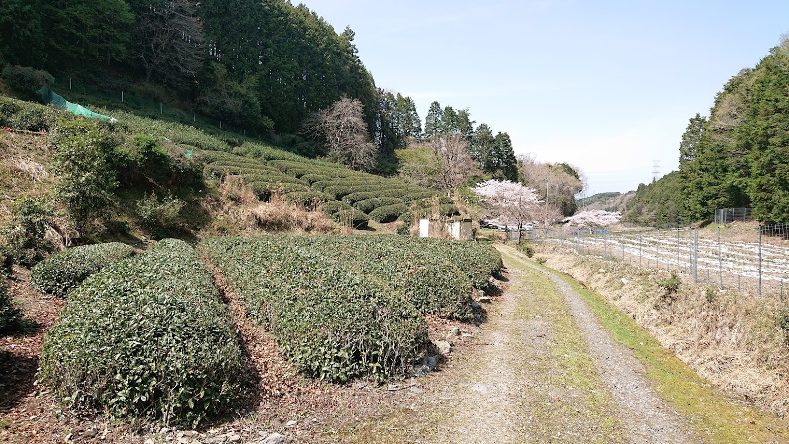 桜の一本樹を目印にして道が分岐する。直進すれば伊賀越えの山道である。右に曲がると小川の谷を埋め尽くすように茶畑が広がった。聞いた話の通り防霜ファンは一本としてない。その風景はまるで昔から変わらなさそうだ。しかし、一部ではマルチを敷いて茶の幼木が育てられている。